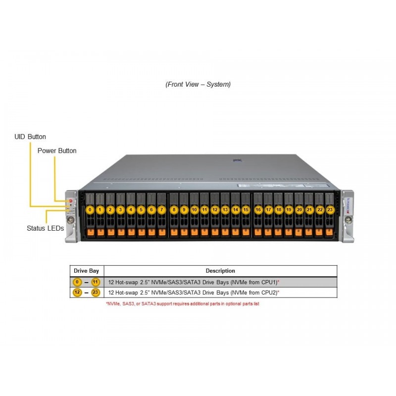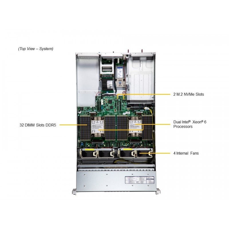 Serwer o potężnej mocy obliczeniowej, wyposażony w procesory Intel® Xeon® z serii 6700/6500 z rdzeniami P lub z serii 6700 z rdzeniami E. Dysponuje 32 slotami DIMM, które wspierają do 8TB pamięci. Dodatkowo, serwer oferuje opcjonalne konfiguracje slotów PCIe - do 8 slotów PCIe 5.0 x8 lub 4 sloty PCIe 5.0 x16, które obsługują karty GPU/Accelerator o podwójnej szerokości. Zaletą produktu są elastyczne opcje sieciowe z możliwością posiadania do 2 slotów sieciowych AIOM (kompatybilnych z OCP NIC 3.0). Model ten dysponuje 8 hot-swapowymi zatokami na dyski o rozmiarze 2.5" obsługującymi NVMe/SATA/SAS. Istnieje możliwość konfiguracji tych zatok, z opcją rozszerzenia do 16x/24x hot-swap zatok na dyski 2.5" NVMe/SAS/SATA.