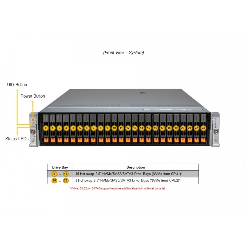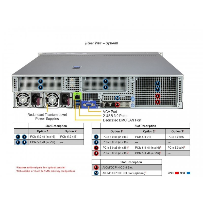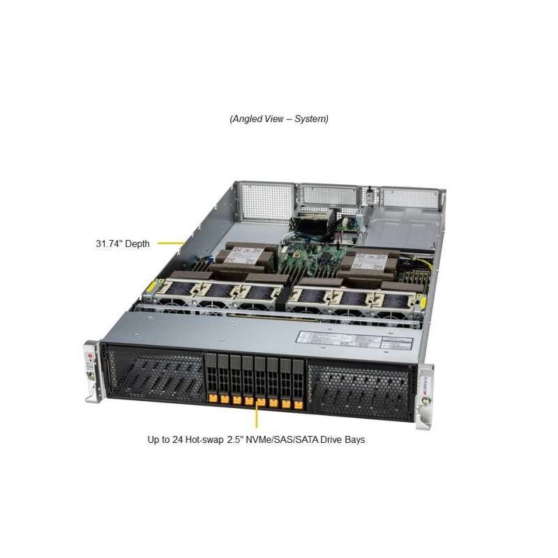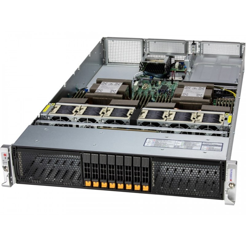 Serwer wyposażony w podwójne gniazdo procesora Intel® Xeon® serii 6900 z rdzeniami P o mocy do 500W, oferujący niezrównane osiągi i efektywność energetyczną. Obsługuje do 24 rdzeni DIMM, umożliwiając rozbudowę do 6TB 6400MT/s DDR5 RDIMM lub 6TB 8800MT/s DDR5 MRDIMM, co gwarantuje szybką i płynną pracę. Zastosowanie opcjonalnych konfiguracji slotów PCIe dodatkowo podnosi wydajność, umożliwiając użycie do 8 PCIe 5.0 x8 lub 4 PCIe 5.0 x16, z wsparciem dla kart GPU/Accelerator o podwójnej szerokości. Serwer oferuje elastyczne opcje sieciowe z możliwością zastosowania do 2 slotów sieciowych AIOM (kompatybilnych z OCP NIC 3.0). Wyposażony jest w 8 wymiennych hot-swap zatok na dyski NVMe/SATA/SAS o rozmiarze 2,5".