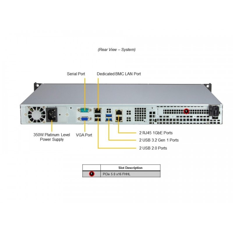 Ten serwer wykorzystuje technologię Single Socket V0 (LGA-1700) i obsługuje procesory Intel® Xeon® serii 6300 / E-2400 oraz Intel® Pentium®. Wyposażony został w 4 sloty na pamięć DIMM, umożliwiające zainstalowanie do 128GB pamięci DDR5 ECC UDIMM o prędkości do 4400MHz. Jego konfiguracja obejmuje również jeden slot PCIe 5.0 x16 (FHHL). Dla komunikacji sieciowej służy mu kontroler Intel® Ethernet i210 z dwoma portami 1GbE RJ45. Jest zasilany za pomocą pojedynczego, platynowego zasilacza o mocy 350W. Jest to sprzęt o wysokiej wydajności, stworzony z myślą o wymagających zadaniach.